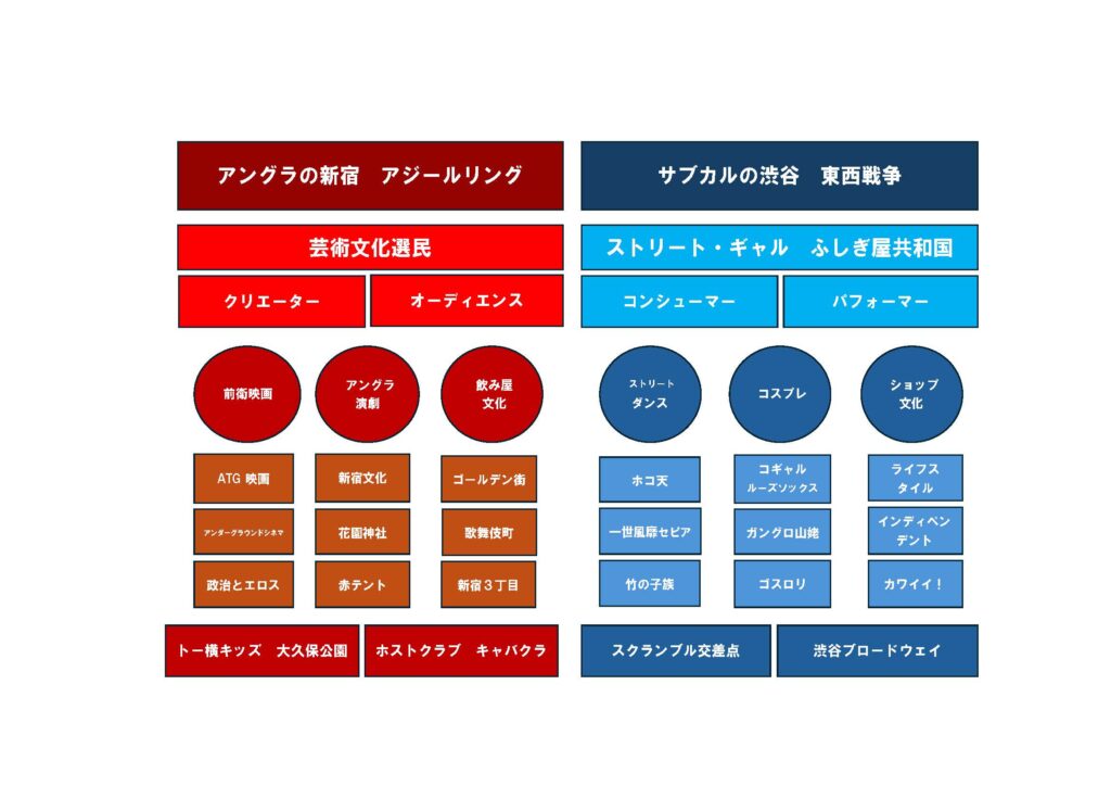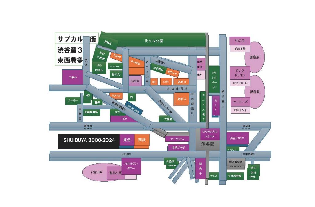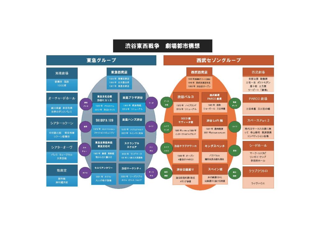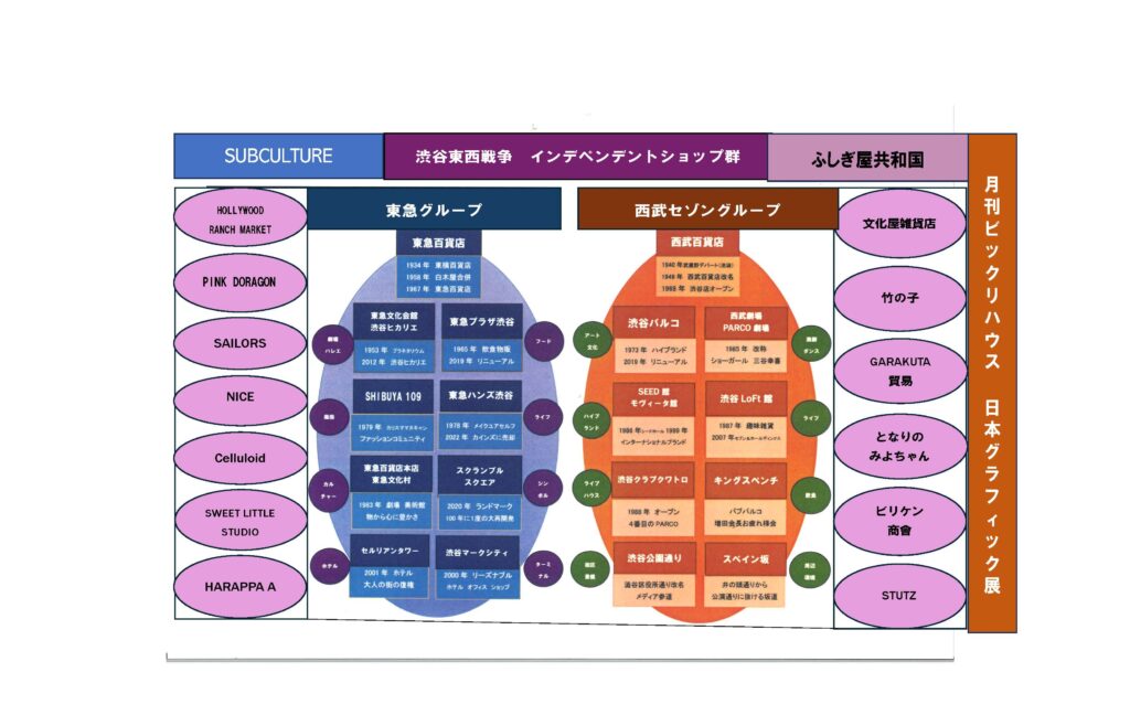1970年代に、渋谷NHK放送センターの近くに住んでいた寺山修司氏が、公園通りにあったエンジンルーム(私たちの会社名)の事務所にフラッと現れ、遊んでいった。渋谷という街の文化は新宿アンダーグラウンド・カルチャーとは異なる。新宿には「花園神社」や「紀伊国屋ホール」「風月堂」「ピットイン」など文化のサンクチュアリー(聖地)が沢山あって、それを取り囲むようにゴーゴーバアや飲み屋が取り巻いているアジール(悪所)がある「アンダーグラウンド・カルチャー」の拠点。一方、渋谷は企業である西武と東急の「渋谷東西戦争」が新宿よりも女性的なタウンを形成していった。それが「サブカルチャー」の街に成長していたのだと思う。鉄道沿線には学校も多かったし。今、三谷幸喜氏の脚本で渋谷の街の小劇場演劇のドラマ「もしもこの世が舞台なら、楽屋はどこにあるのだろう」(TBS水曜10時)が放映されているが、「百軒店」あたりをイメージした80年代渋谷の街を面白く描いている。ここには「竹の子族」や「一世風靡」や「ホコ天」が路上で歌い踊っていた代々木公園があり、そこから南に公園通りへ降りてくるとパルコや「山手教会」の「ジァンジァン」があった。こうした中で、西武セゾングループがこの時代の渋谷の文化をつくってきたのは明らかだと思う。しかしこの後は土地や資本を持っている東急は負けじと「文化村」を作り、「マークシティ」を作り、「セルリアンタワー」や「ヒカリエ」、「スクランブルタワー」など続々と開発を続けている。呉服系百貨店でない鉄道系の西武も東急も人を移動させることが、企業コンテンツとして最重要項目だったのだと思う。その通り渋谷には多くの人が今日も押しかけてきている。
