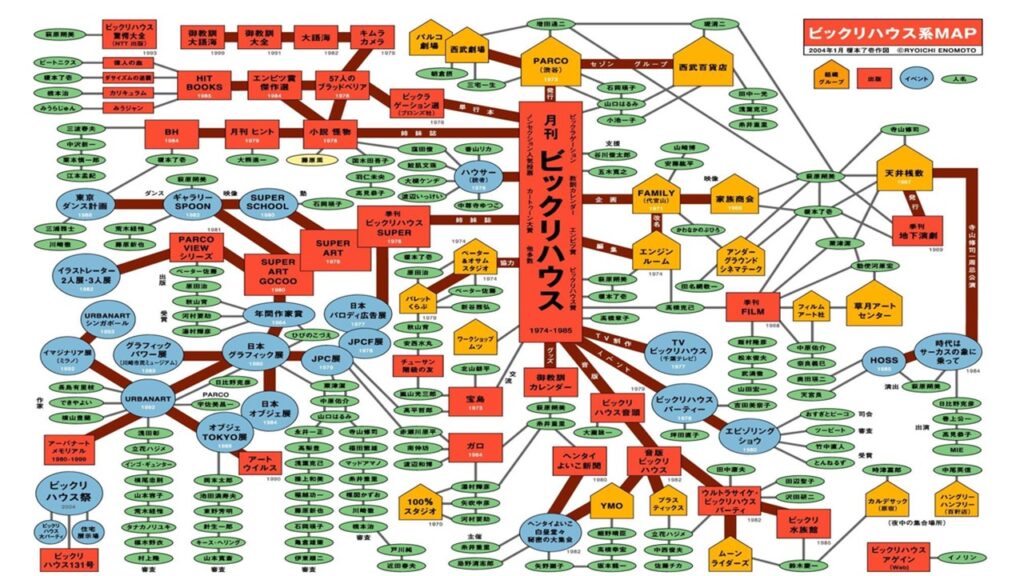 gggブックス-127「RYOICHI ENOMOTO」の冒頭で萩原朔美氏が語っているように、榎本氏の表現活動はイラストレーションやデザインや詩作だけでなく、「関係性の図像化」も圧倒的。その一部が下の図になる。「ビックリハウス」を取り巻く多くの方々の関係、渋谷という街の坂の上と下の関係、西武セゾングループと東急グループの関係、新宿という街の構造、渋谷と新宿の違いなどが、空間と時間を超えて分かりやすい図像になって、いきいきと表現されている。榎本氏の軌跡が紹介された「東京モンスターランド」「ENOMOTO RYOICHI」は下の画像。また氏は21世紀以後、俳句を始めたということで、榎本バソン了壱名で作品集も出版されている。