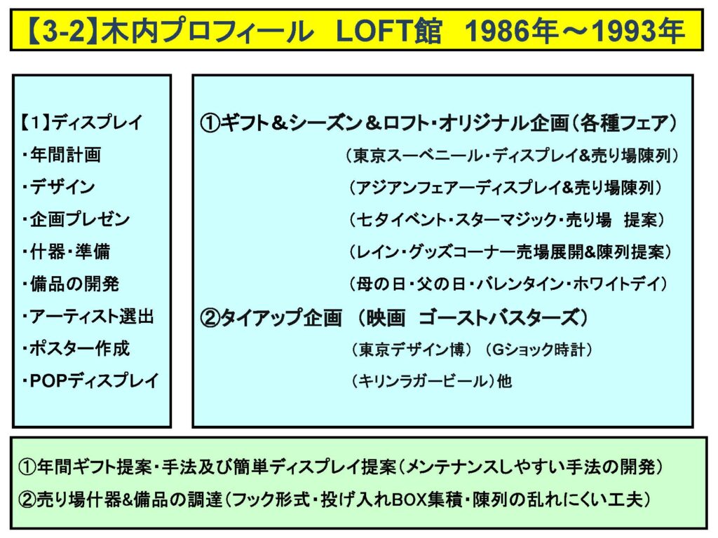 このころは1992年に人事研修会社ウイルの仕事でVMDマニュアルの本を作たことからこれを請負うようになり、1996年には売場づくりやビジュアル・プレゼンテーション講座のビデオ教材を作成した。主にファッションはシード館で撮影した。雑貨編はロフト館で撮影した。この教材で全国の人がディスプレイと売場作りのノウハウを学ぶことになった。ロフトは生活雑貨やインテリアや文具やギフト対応の雑貨類が多かったので思った以上に全国的に好評で教材は売れた。また92年には西武の社内教育用に人事部とウイルの依頼により、木内氏は60ぺージのVMDハンドブックを作成した。ロフトではフロアごとのテーマもあり、さらに季節ごとに色々なモチベーションテーマで装飾を行ったり館ごとのタイアップイベントも沢山あった。