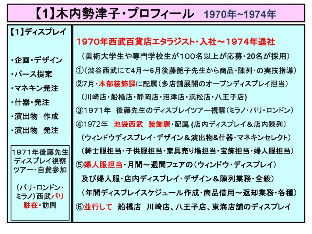 木内勢津子氏は1970年に西武百貨店に入社。エタラジスト1期生であった。西武の募集要項を見て受験に行ってみたら、あらゆる専門学校や美大等の卒業女性が100人程来ていて、そこから20名だけが選ばれ渋谷西武で3カ月研修を受けた。当時はアパレルの中でも虫ピンで洋服をトルソーや壁面に貼り付けるピンワークがメインの仕事で、さらに服に芯地を入れて立体化して見せたりした。西武では当時の第一人者である後藤艶子先生から基本的テクニックを学んだ。そして本部に配属され、7月頃から関東と東海地区の開店を担当し八王子店や川崎店も担当した。当時始まった多店舗展開で出店した各店のウインドーから店内装飾全般までを担当し、毎週毎週各店への出張があった。しばらくしたら東海地区には別スタッフが入ったが出張が多かった。しかしエタラジストの女性は2年程で結婚などで辞めてしまう人も多かった。その後池袋店を5人程で担当しながら、関東店舗も継続して担当したが、これが力になった。71年には後藤艶子先生のヨーロッパツアーにも行き、西武のヨーロッパでのパワーを感じた。池袋の婦人服は特に、販促の季節ごとのフェアのテーマに合わせ、自分でパースを書いてエタラジストメンバーと打合せしてから、売場朝礼では販売メンバーに演出の趣旨を説明して、その演出テーマにふさわしい商品の調達をお願いした。南北に細長い池袋店の婦人服にはメインステージが途中に何カ所もあって大変だったが、ディスプレイ計画を立てる所から売場メンバーへの説得まで仕事全体の流れをつかんだ。もちろん繁忙期には売場応援に出て、百貨店の仕事の全体が勉強になった。
