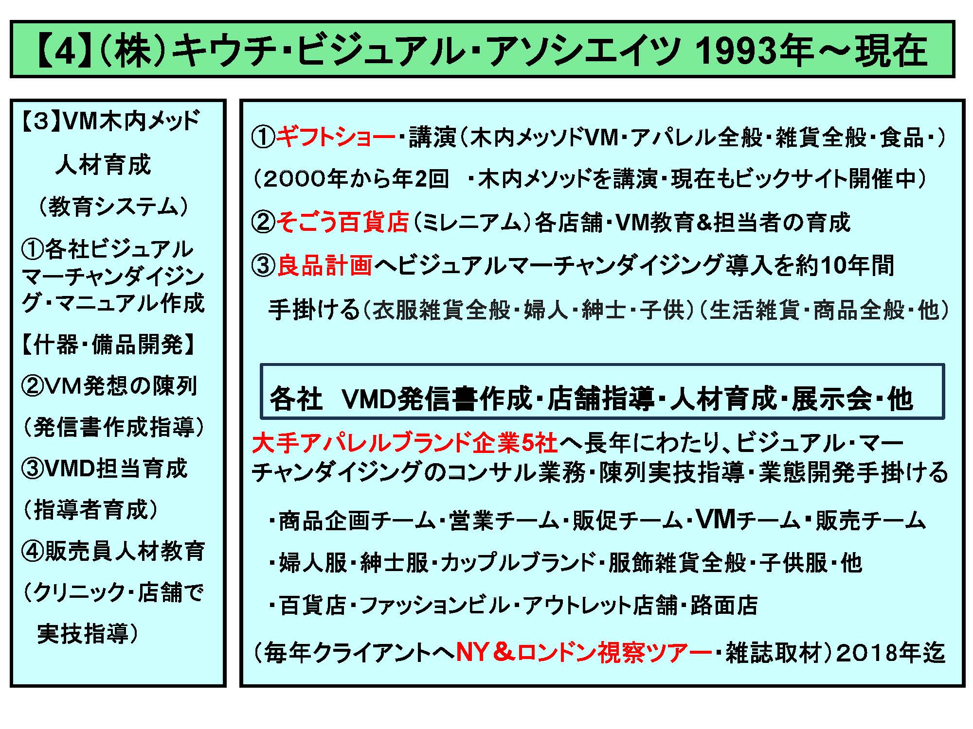 1993年にロフトシードを去り、この年に㈱キウチアソシエイツを作った。このころ雑誌ギャップジャパンの取材で良品計画の有賀氏を訪問したら、特にニューヨークのVMDの実態を知りたがられたので、1つのプロトタイプ売場を作り、これを全米にディフュージョンするやり方やノウハウについてご説明した。また全店VMD担当者を副社長待遇にして数値責任を持たせる組織の在り方など説明したら、その後有賀氏は社長になられて、多店舗展開に向けて、売場開発課を作りたいのと、全国店頭に働く人に共通認識を持たせるための仕事をしてほしいと言われ、一緒にお店を見たら、領域別に看板が下がっていて、トルソーもピン打ちなので売場スタッフではメンテナンスできない。これではだめだと思い、領域別サインなどはやめて男性や女性のトルソーを置けばよいと考え提案し、軽くて売場の女性がメンテナンスできるように備品も見直して制作した。3年位で売場メンバーがやり方を理解できるようになり、まずモデル売場を作って陳列した発信書を作り、ファッション雑貨類やバッグなど多様なアイテムをどう見せるか、キウチメソッドで誰でも売場が作れるように6年程かけてMUJIのVMDマニュアルを整備し、衣料品、雑貨、食品など領域別に見せ方を徹底した。MDさんによる発信型の陳列指示書だけあっても実際の売場はうまくできない。対応できる什器がない場合もあるからだ。その売場なりに指定什器がない場合にどうやって売場着地させていくのか応用できるスキルを教えた。このころは無印良品は杉本貴志氏のディスプレーデザインも目を見張るほどであり、素晴らしいアイディアをたくさん出された。また無印メンバーも良く働いていた。アメリカ式にフィクスチャーバイブルというルールブックによって売上を作っていくMUJI VMDマニュアルも作った。10年近く無印をやって各売り場のVMD力は、とても成長した。そのころから、色々な百貨店に出店している大手アパレル各社さんからも評判を聞きつけてオファーがきたので、大手アパレル各社のVMDマニュアルも作ることになった。そのうち1社のための大型総合売場の提案をアメリカのVMD+SD誌に応募したら賞をとれた。クリスタルのトロフィーが出たのでそのメーカーさんは多変喜んでくださった。